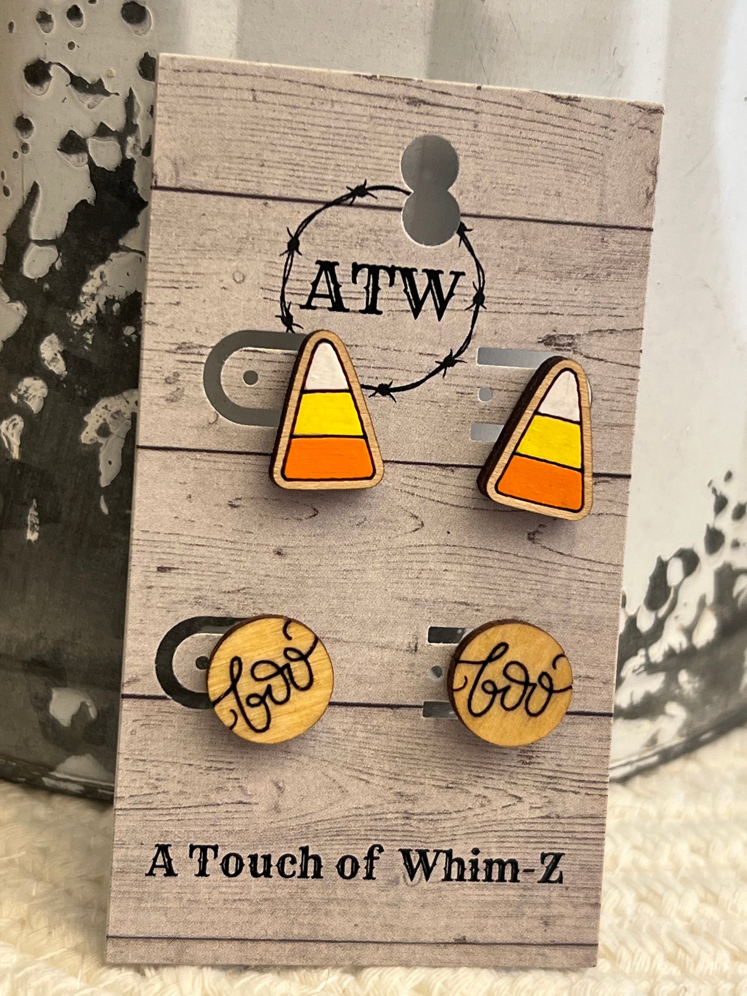 Add a splash of fall to your wardrobe with this twin pack of hand painted wood stud earrings! Featuring a pumpkins and a candy corn shaped stud. Each earring offers a playful, fun-loving vibe! Nickel-free, so everyone can enjoy the perfect amount of seasonal chic. Get into the spirit of autumn! (pun intended)