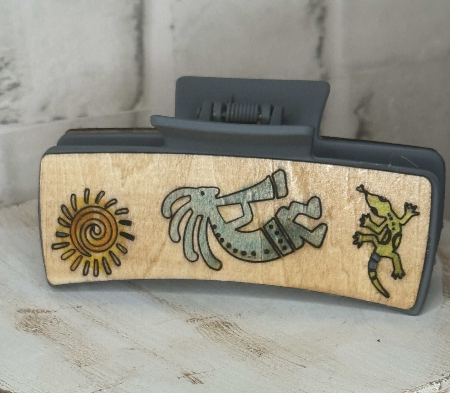 Add some luck and good vibes to your look with our Kokopelli Dancer Hair Claw. Embodying rain and fertility, this wood cover claw is perfect for a quirky charm and comes in blue or red. Get ready to bring in the bounty with this unique accessory! (Limited quantities available, so grab yours now!)