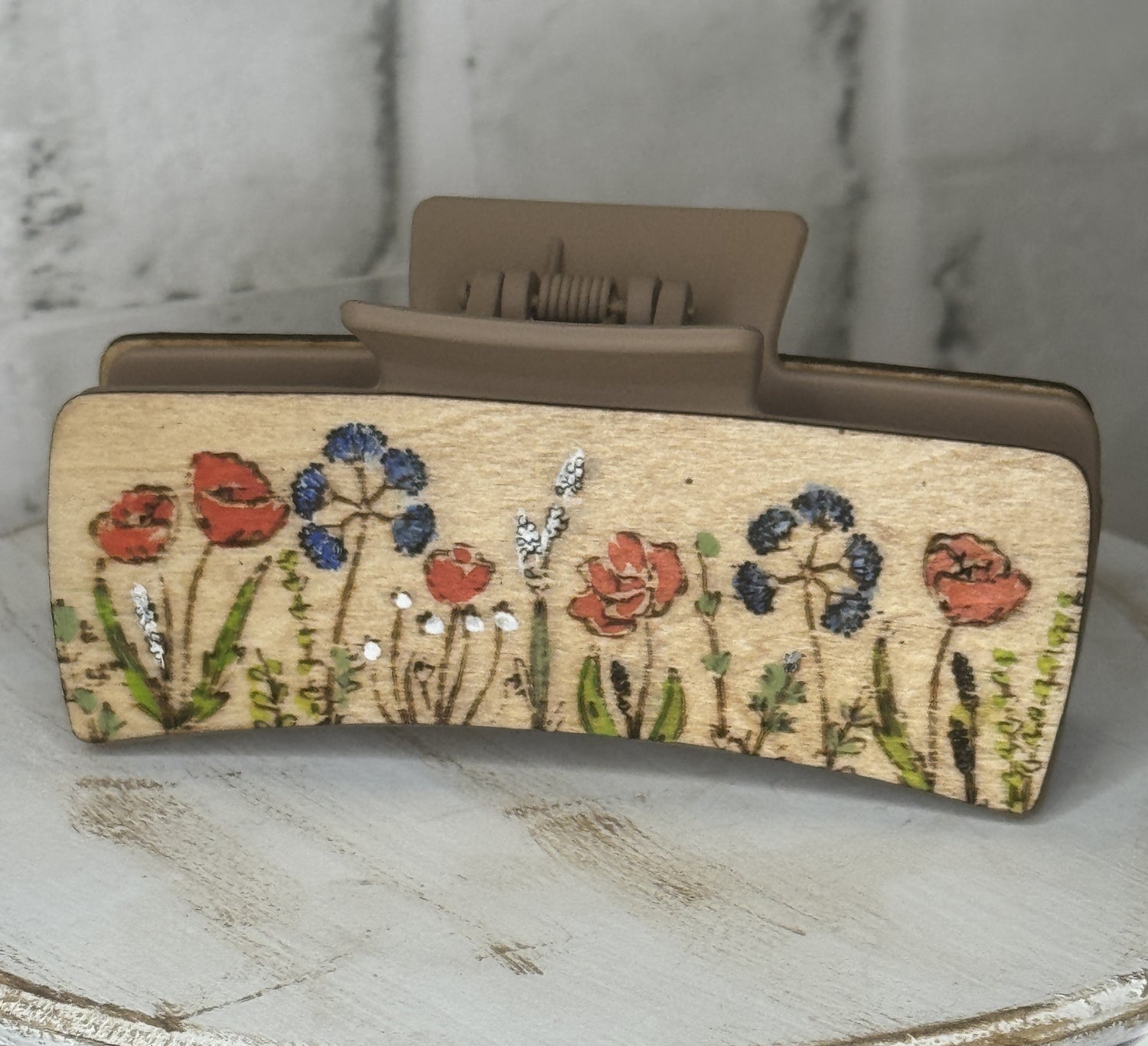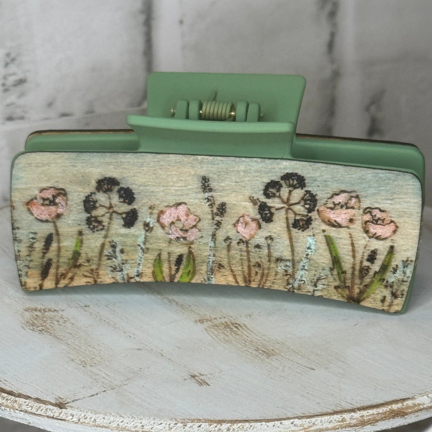 Spruce up your look with our One of a Kind Wildflower Hair Clip. Handcrafted and hand-painted, each one features a unique mix of colorful wildflowers. Bring a touch of spring to any outfit with your choice of green, blue, pink, or natural color. Don't miss out, these limited edition clips will not be restocked! 4 inches