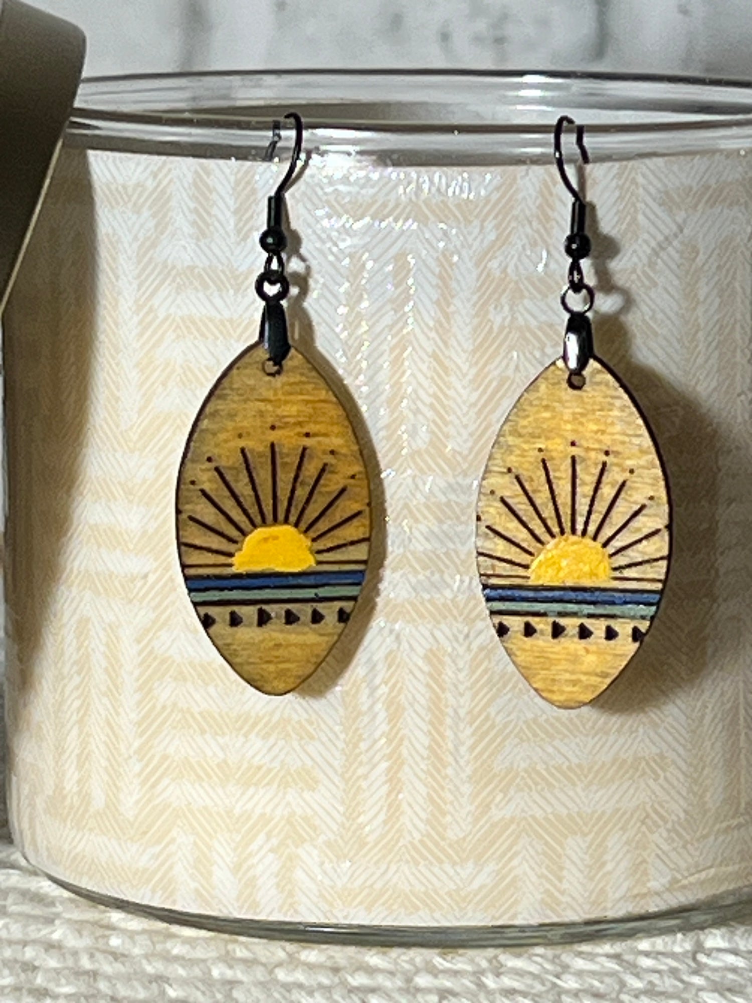 "Add a playful touch to your outfit with our Sunrise Sunset Dangle Earrings! These earrings feature a classic sun design, with a unique twist - depending on your view, it could be a stunning sunset or a beautiful sunrise. With a touch of native flair, these earrings are sure to make a statement. Perfect for any occasion."