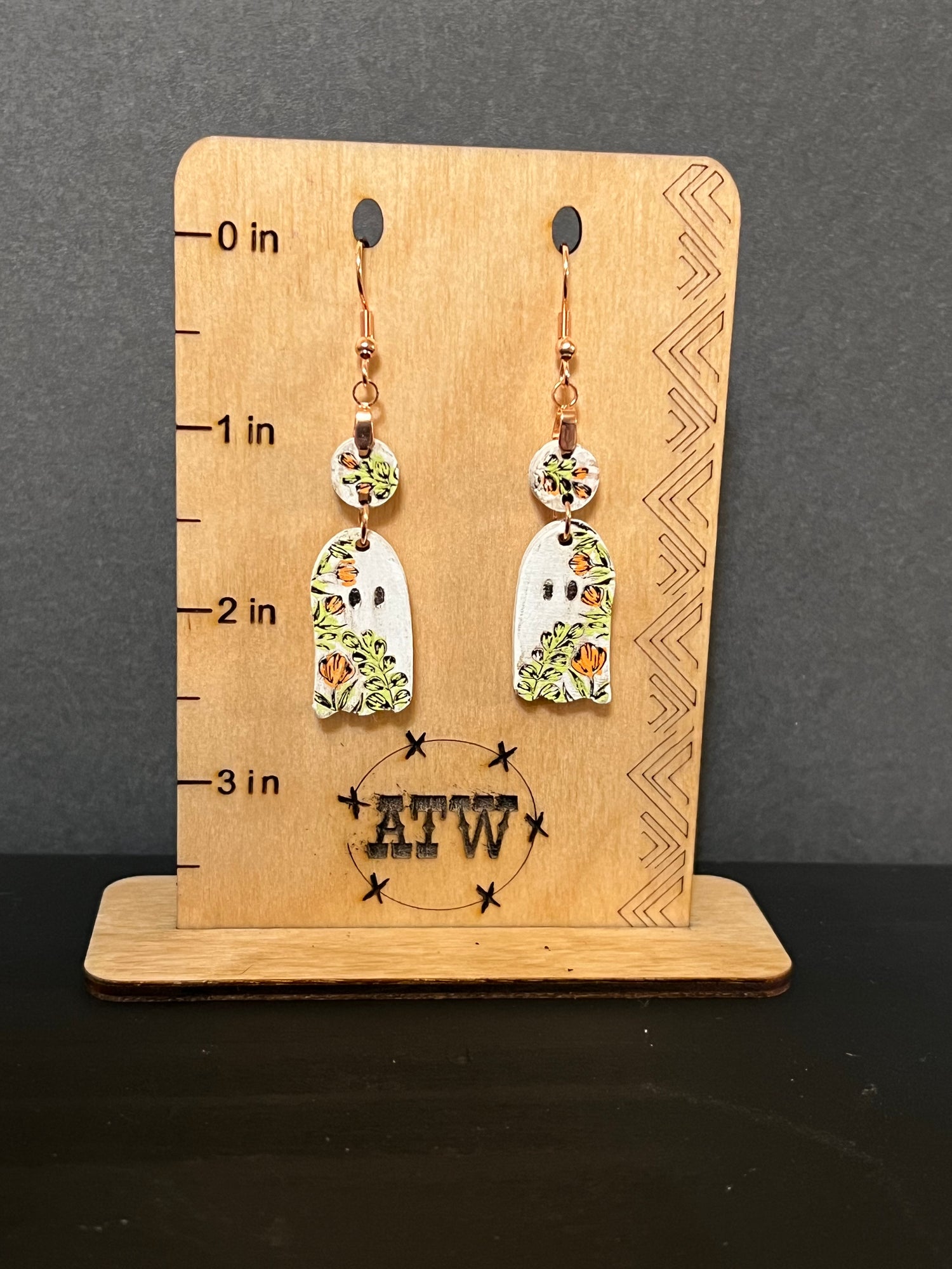 Spice up your wardrobe with these sweetly spooky Bashful Ghost Dangle Earrings! Hand painted onto wood, these earrings feature cute little ghosts sneakily hiding in the bushes. Make a playful statement and add a supernatural twist to your look! (Boo-tiful!)